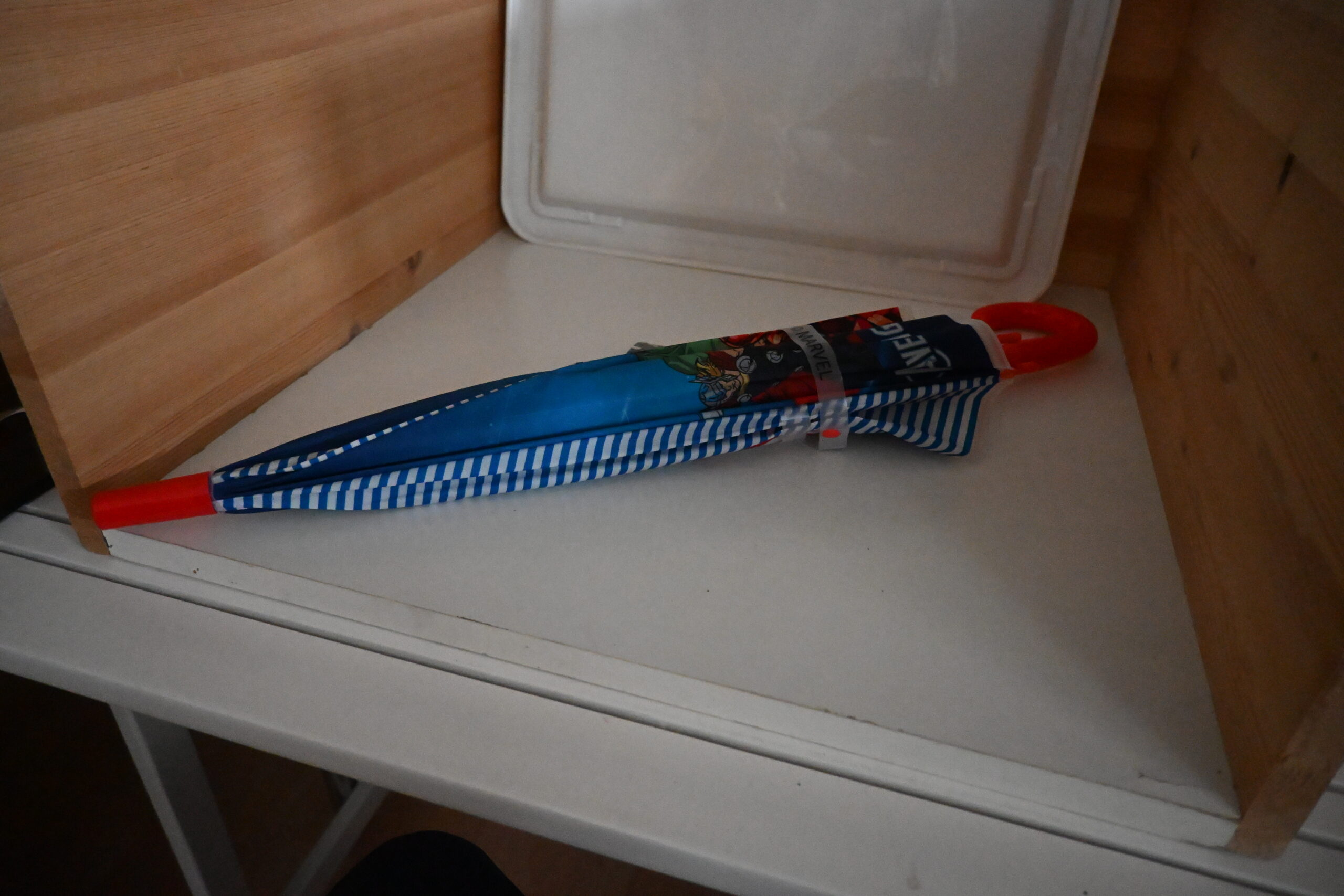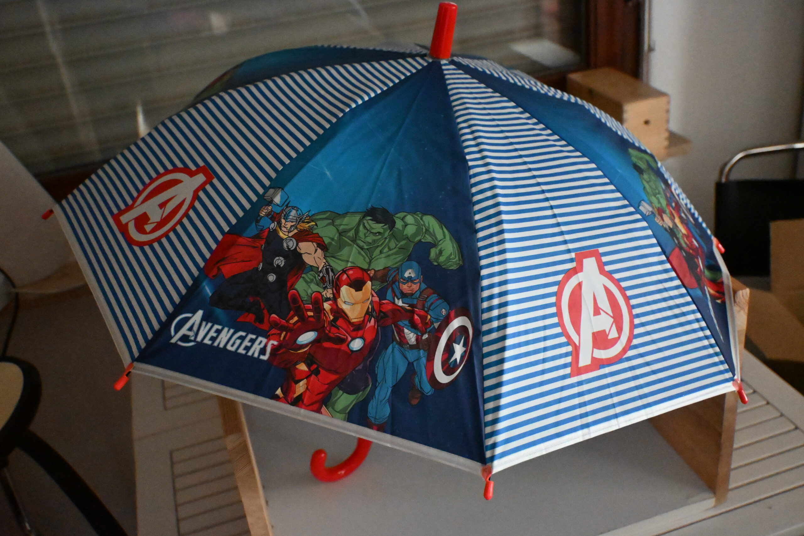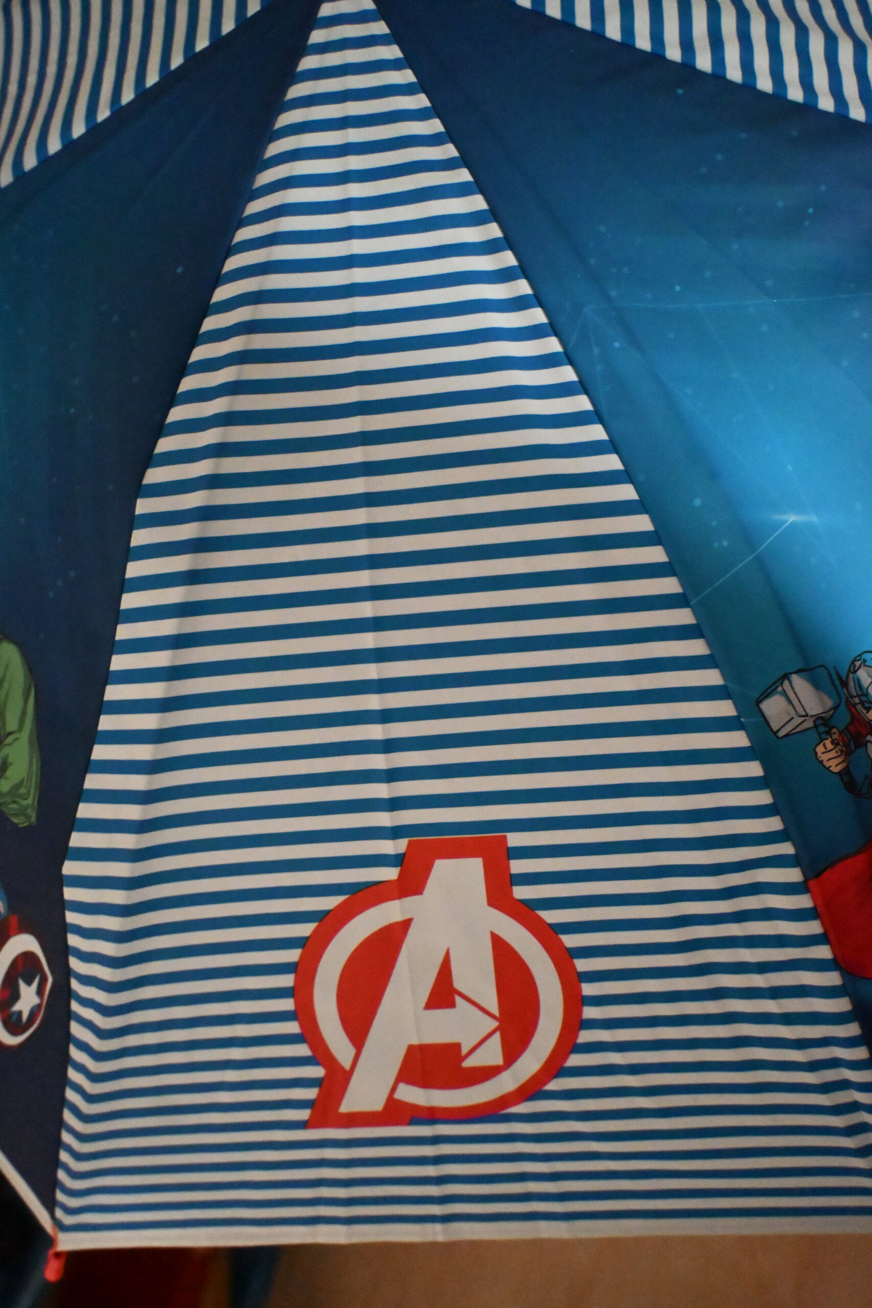 Auf dem blauen, mit weißen Streifen gemusterten Schirm sind die beliebtesten Superhelden des Marvel-Universums abgebildet – darunter Iron Man, Hulk, Captain America und Thor.
