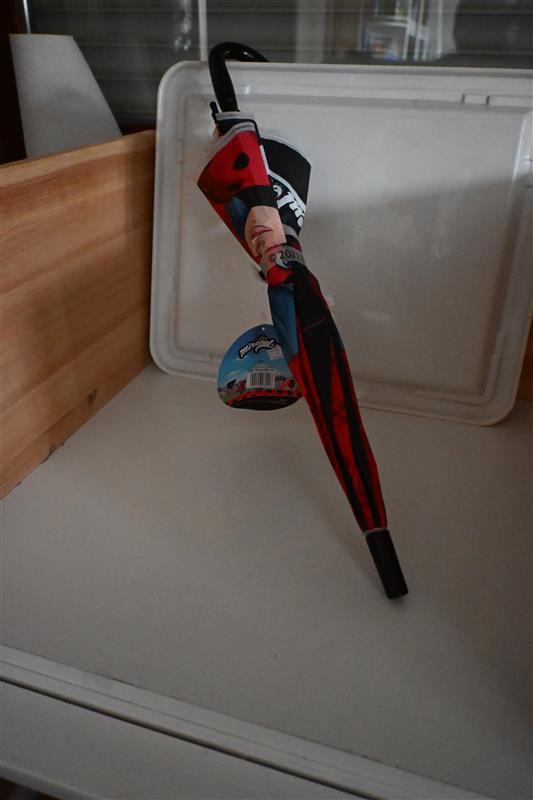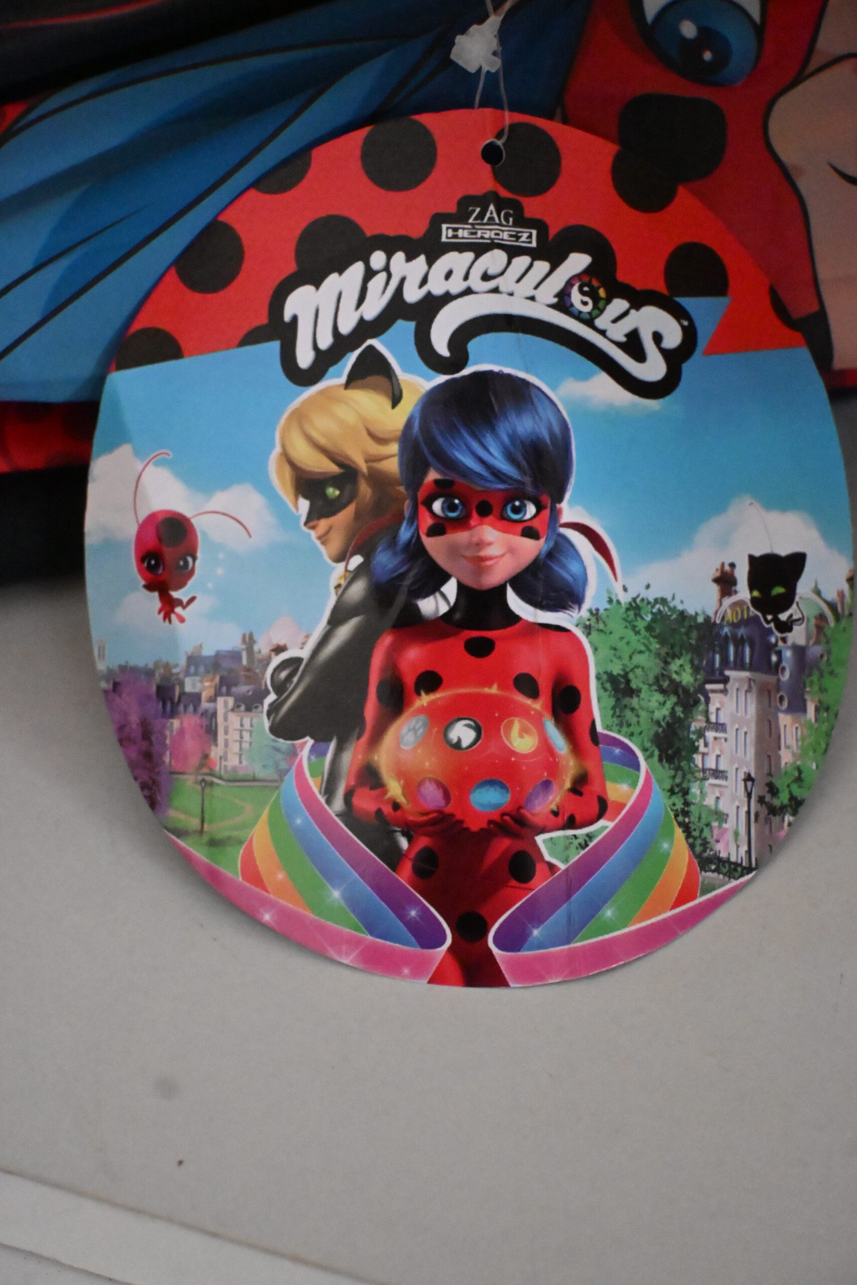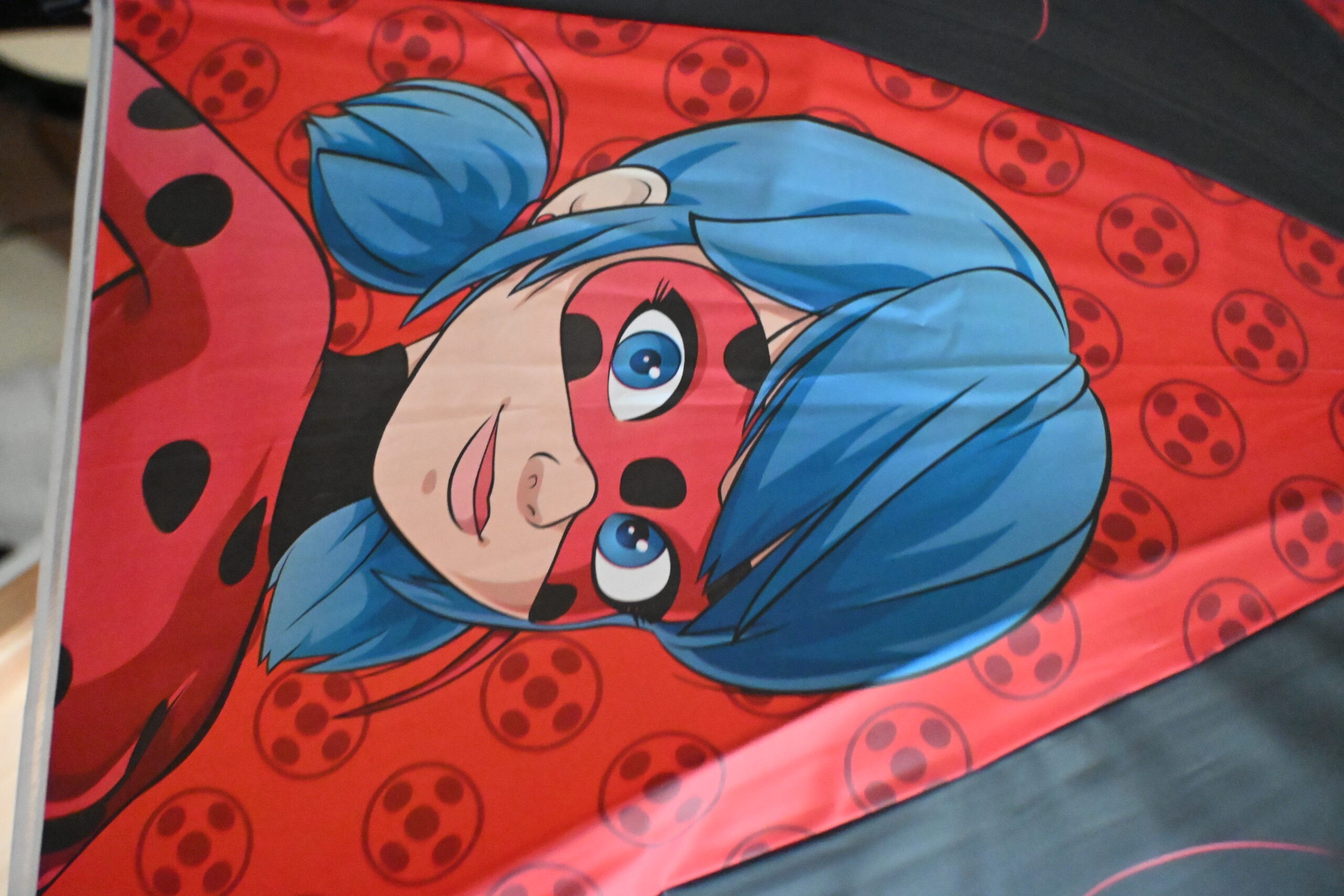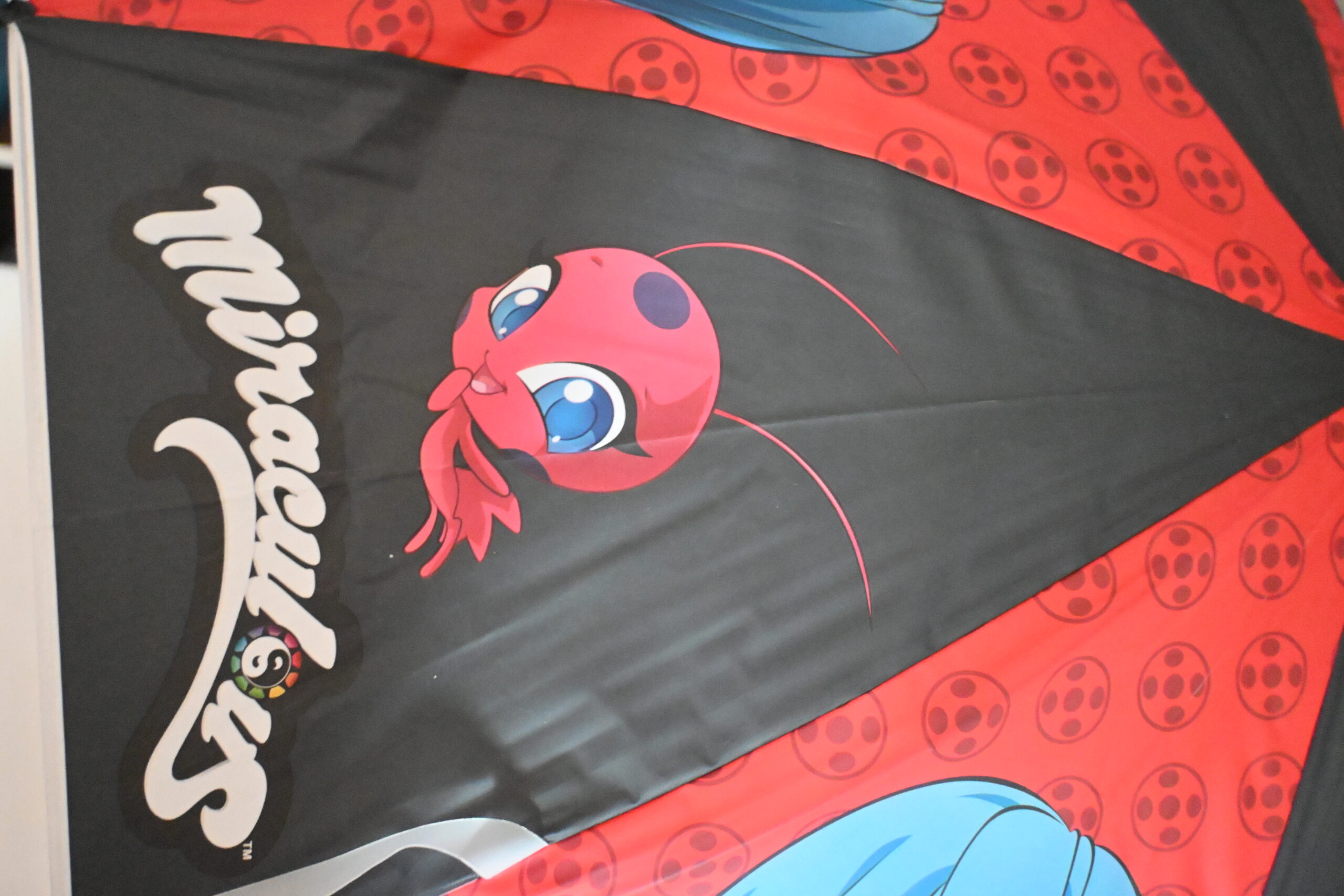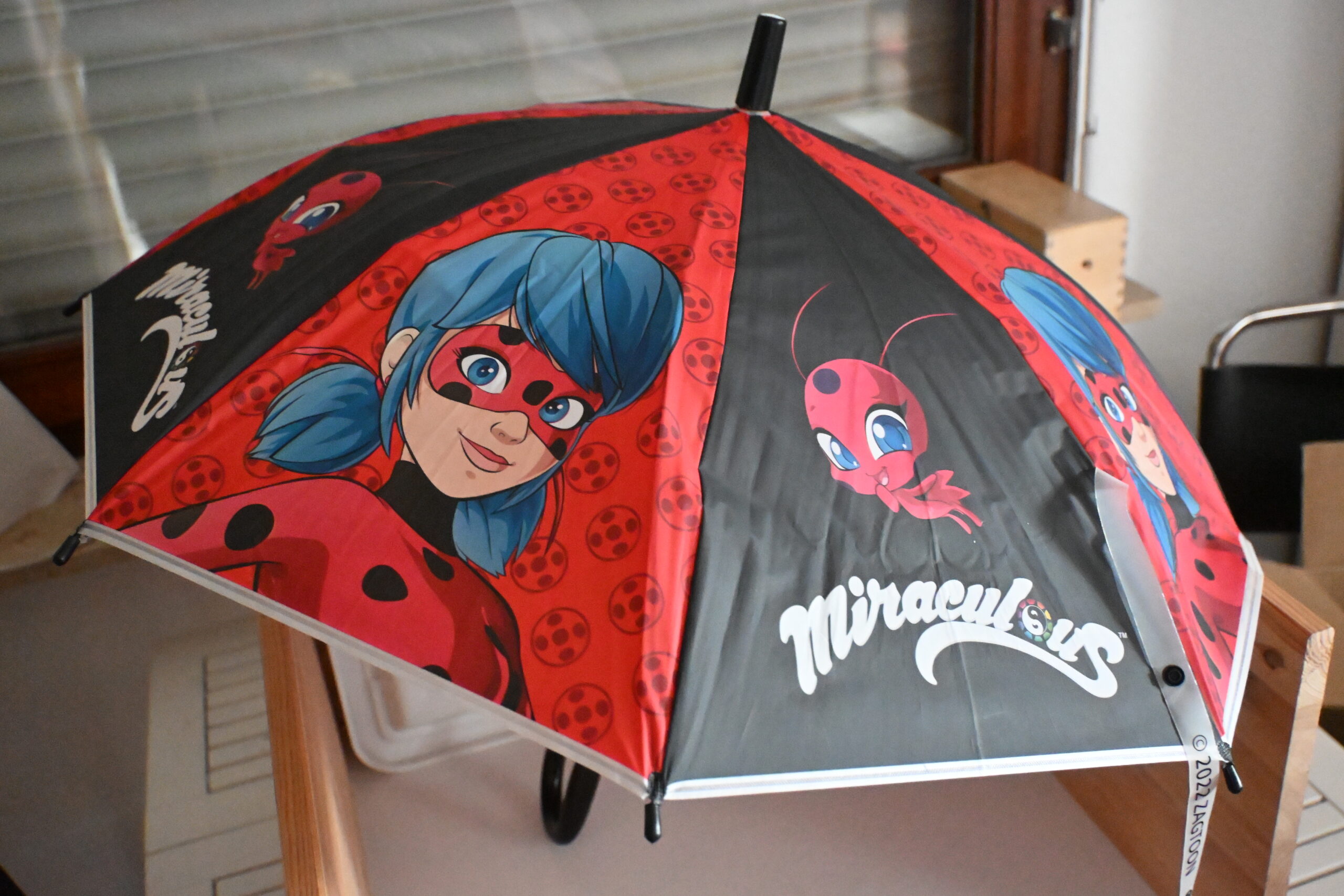 Dieser farbenfrohe Miraculous Ladybug Kinderschirm (ZAG Heroez) bringt gute Laune an Regentagen. Die Bespannung zeigt Ladybug mit typischem Marienkäfer-Look sowie Tikki und den „Miraculous“-Schriftzug. Der Schirm ist ca. 60,5 cm lang, leicht zu öffnen und dank stabilem Gestell alltagstauglich. Der schwarze Haken-Griff liegt sicher in Kinderhänden – ideal für Kindergarten, Schule und Freizeit.